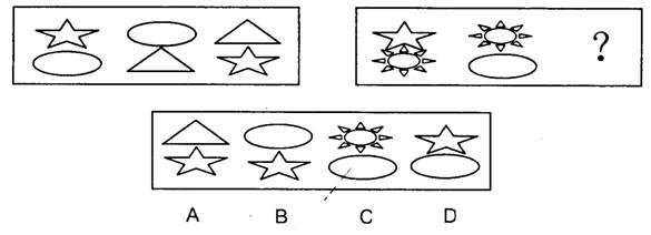 B在第一套图形中,中间图形为两侧图形去掉相同部分整合而成,且内部分组成的位置颠倒,由此可推知,第二套图形也遵循这个规律,选B。在第一套图形中,中间图形为两侧图形