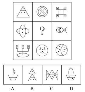 第一步,观察特征。元素组成凌乱,优先考虑数量类或属性类。题干每幅图中都有小黑点,首先考虑小黑点数量。第二步,九宫格,横向规律较为常见,优先考虑。第一行小黑点个数分别为:3、2、4,第三行分别为:3、2、4,第二行应符合此规律。问号处黑点数为2,排除B、C。观察A、D,封闭区间数量明显不同。第一行封闭区间数量分别为3、3、5,第三行为4、3、4,两行封闭区间总数都是11。第二行封闭区间数量分别为5、?、3,问号处封闭空间为3。因此,选择A选项。拓展近几年的考试当中,经常会考查两种元素的数量运算,如:素的数量和面的数量、面的数量和线的数量等。