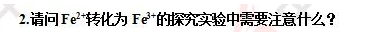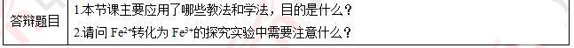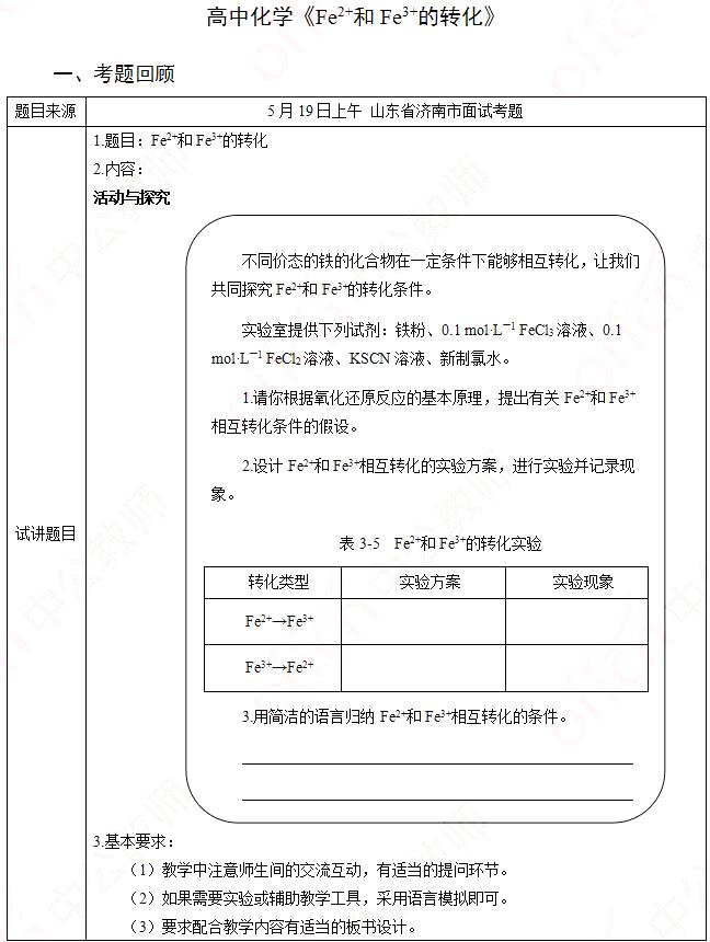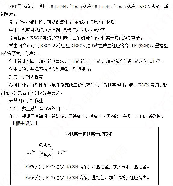 二、考题解析【教学过程】环节一:魔术导入茶水变墨水(烧杯中放入茶水,用玻璃棒的一头搅拌,茶水变黑;悄悄换玻璃棒的另一头搅拌,茶水变回原色。)提问学生:“看到了什么实验现象?这是为什么?”题目来源于考生回忆学生思考讨论,教师解释原因:玻璃棒的一端事先蘸上绿矾粉未,另一端蘸上草酸晶体粉未。茶叶水中有一种单宁酸,它与绿矾发生化学反应,生成一种叫单宁酸铁(亚硝酸铁)的蓝黑色物质;草酸具有还原性,将三价的铁离子还原成两价的亚铁离子,因此,溶液的蓝黑色又消失了,重新显现出茶水的颜色。那么亚铁离子与铁离子的相互转化的条件是什么?环节二:新课讲授活动1:结合实验,引导分析提出问题:“亚铁离子转化为铁离子,化合价从正二价变为正三价,化合价升高,根据氧化还原反应的原理,要实现亚铁离子与铁离子间的相互转化需要加入什么?”学生思考回答:“要实现亚铁离子转化为铁离子,应加氧化剂。要实现铁离子转化为亚铁离子,应加入还原剂。”教师点拨:在化学学习中,分析化合价是了解物质性质的一种非常重要的方法。活动2:实验探究,实现转化