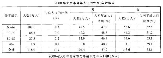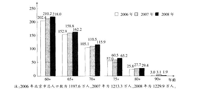 A.2006-2008年,北京市老年人口逐年递增B.2006-2008年,北京市老年人口占总人口的比重逐年递增C.2006-2008年,北京市分年龄段老年人口在各年龄段都逐年递增D.2006-2008年,北京市人口老龄化现象加剧