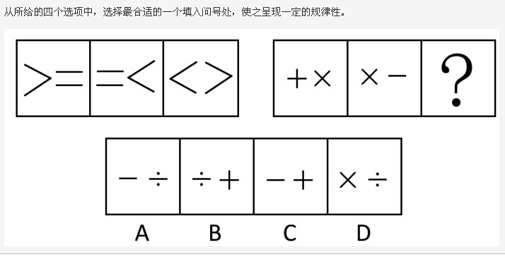 第一组图形中,每个运算符号均出现两次,因此第二组图形也应符合该规律,通过分析选项只有C项中图形符合。故正确答案为C。