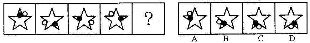 本题考查的是图形元素位置的变化。观察图形可发现黑色小球和白色小球分别在五角星内和五角星外移动。黑色小球在五角星内,在两边相交而成的内角上,每次顺时针旋转两个内角。白色小球在五角星外部,在两边相交成的外角上,每次逆时针旋转两个外角。只有C项符合此规律。