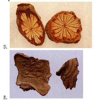 图中D为大血藤,来源于木通科植物大血藤的干燥藤茎。其主要的特征是断面皮部红棕色,有数处向内嵌入木部,木部黄白色,射线呈放射状排列。