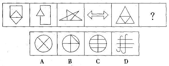 图形推理。请按每道题的答题要求作答。从所给的四个选项中,选择最合适的一个填入问号处,使之呈现一定的规律性。()