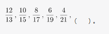 本题属于分数数列。 以分数线为分割线分成上下两个数列,分子为:12,10,8,6,4,为公差为-2的等差数列,下一项为2;分母为:13,15,17,19,21,为公差为2的等差数列,则下一项为23;所以( )为2/23。