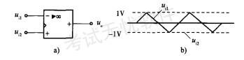 将运算放大器直接用于两信号的比较,如图a)所示,其中,ua = — 1V,ua的波形由图b)给出,则输出电压uo等于: