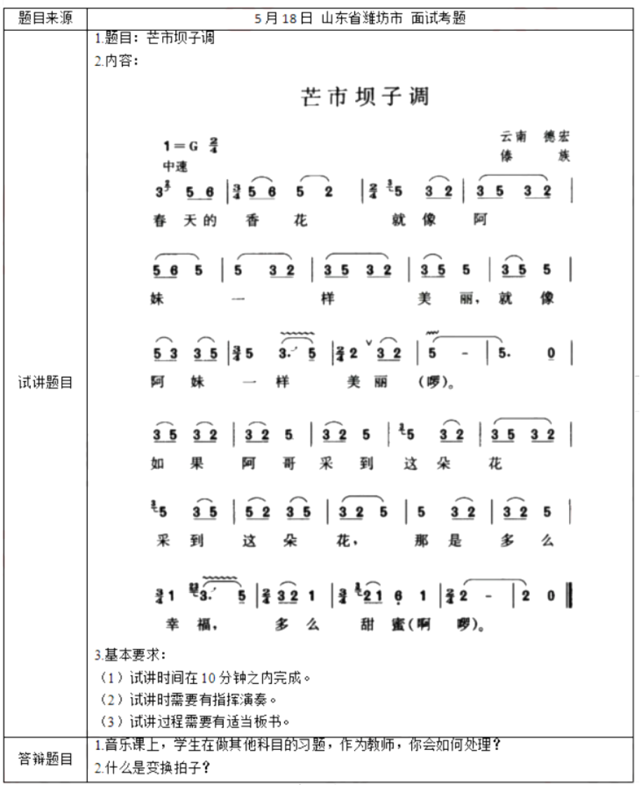 初中音乐《芒市坝子调》 一、考题回顾
