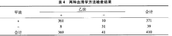 208.某研究室用甲乙两种血清学方法检查401例确诊的鼻癌患者结果(表4)。