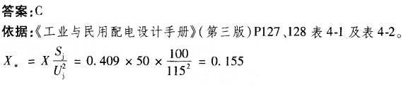 已知一条50km长的110kV架空线路,其架空导线每公里电抗为0.409Ω,若计算基准容量为100MV.A,该线路电抗标么值是多少? ( ) (A)...
