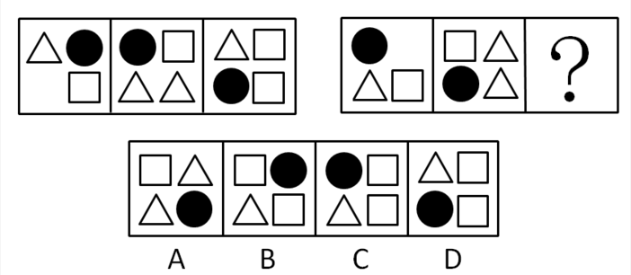 元素考点包括元素叠加和元素周遍两个考点。本题考点为元素叠加中的黑白叠加。第一串图形中,白三角形+黑圆形=白三角形;黑圆形+白正方形=白正方形;空+白三角形=白实心圆形;白正方形+白三角形=白正方形。根据前一串图形的规律可知只有B项符合。故正确答案为B。