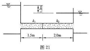 上、下游水箱中间有一连接管,水箱水位恒定,见图21。连接管内充填两种不同的砂层(k1=0.003m/s,k2=0.001m/s),管道断面积为0.01m2,渗流量为( )。