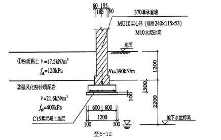 某砌体结构建筑采用墙下钢筋混凝土条形基础,以强风化粉砂质泥岩为持力层,底层墙体剖面及地质情况如图5-12所示。荷载效应标准组合时,作用于钢筋混凝土扩展基础顶面处的轴心竖向力Nk=390kN/m,由永久荷载起控制作用。