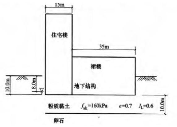 某岛层住宅楼裙楼的地下结构相互连接,均采用筏板基础,基底埋深为室外地面下10.0