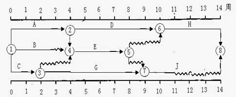 本题考查的是工作顺序安排。B 的总时差和自由时差不等,自由时差为 1 周,总时差为 3 周。