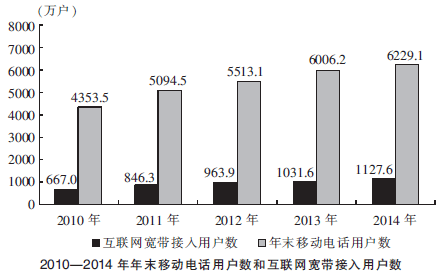 2010—2014年年末移动电话用户数和互联网宽带接入用户数2014 年年末城市固定电话用户数占固定电话用户数的比重比农村所占比重高 ( )个 百分点。