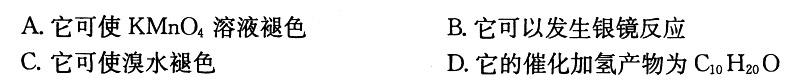 解不饱和烃可以使KMn04溶液、溴水褪色,醛可以发生银镜反应。答案:D