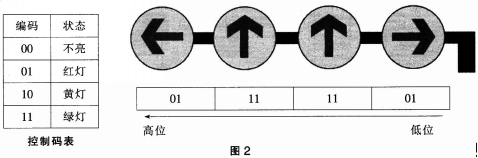模拟某十字路口车道通行状态的编码如图2中控制码表所示,每个车道用一个指示灯指示通行。若某一时段允许中间2个车道直行对应的控制码如图2中右图所示,则某一时段...