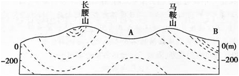 由图可知,A处为背斜成谷的地形构造,A处为背斜的中心,背斜岩层从中间向两翼越来越新。所以A处岩层最老,故自A向B,岩层越来越新。