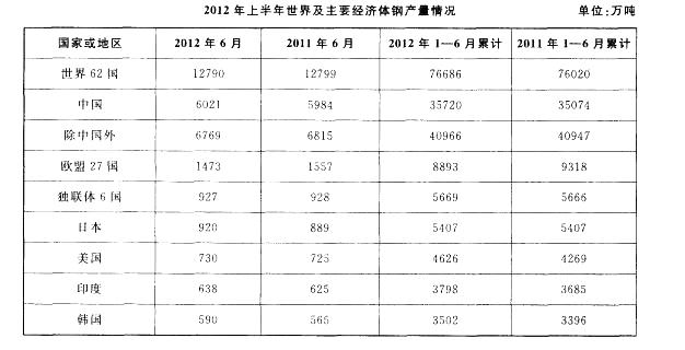 欧盟2011年1----6月钢产量占世界62国的比重为9318 ÷ 76020,超过 10%,但是不到20%,因此选B。
