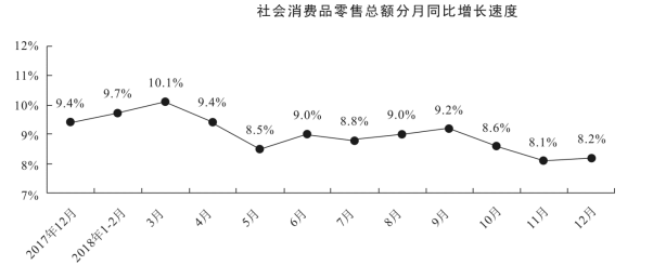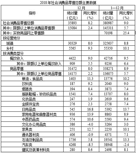 2018年1—12月,社会消费品零售总额380987亿元,比上年增长9.0%(扣