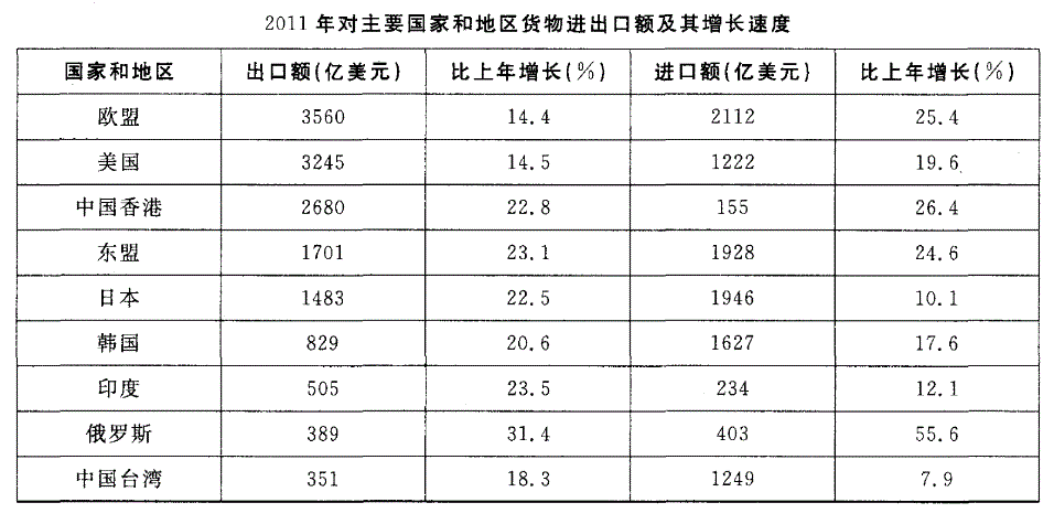 表中所列举的国家和地区中,2011年我国货物进出口贸易差额最大的是( )。