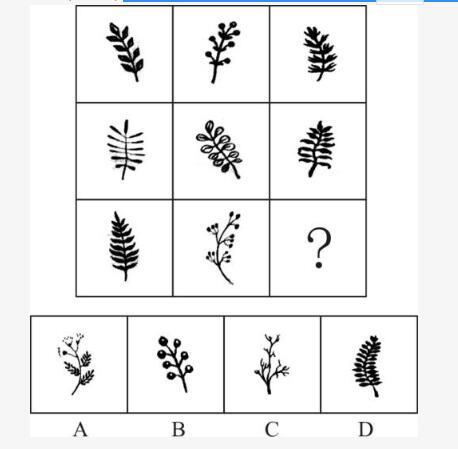 第一步,观察特征。组成元素均为树叶,优先考虑实体信息。第二步,九宫格,横向规律较为常见,优先考虑。第一行中叶子顶部的方向依次为向左、向右、向左;第二行中叶子顶部的方向依次为向右、向左、向右,顶部所偏的方向交替出现;第三行中前两个图形中的叶子顶部偏向依次为向左、向右,所以问号处的叶子顶部应偏向左方,排除C、D项。进一步观察,题干中所有图形中的叶子均是在枝干上的一点向左右两侧对称式长出,排除A项。因此,选择B选项。