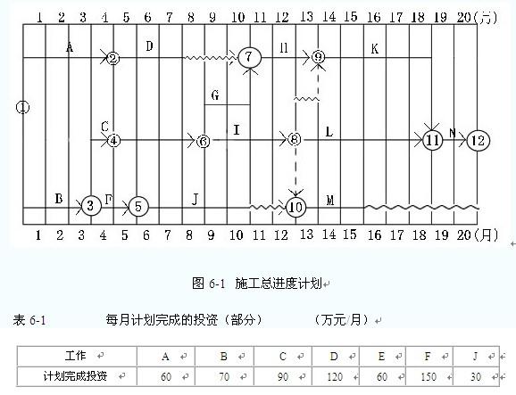 某工程,建设单位与施工单位按《建设工程施工合同(示范文本)》签订了施工合同,采用可调价合同形式,工期20个月,项目监理机构批准的施工总进度计划如图6-1所示,各项工作在其持续时间内均为匀速进展。每月计划完成的投资(部分)见表6-1.