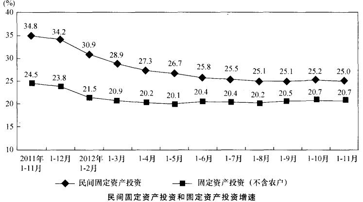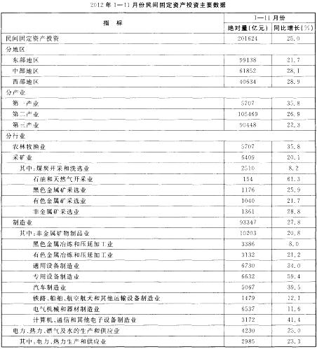 2012年1一11月份,全国民间固定资产投资201624亿元,同比增长25%