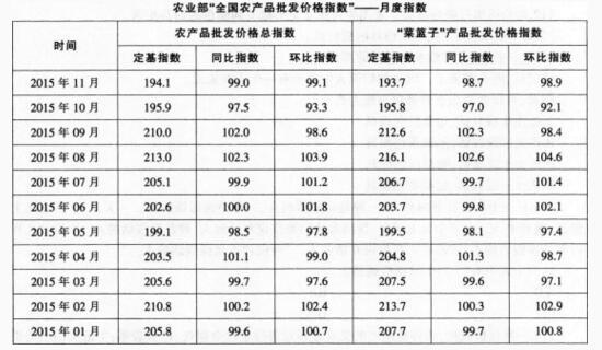 注:定基指数以2000年为100计算,同比指数以上年同期为100计算,环比指数以上月为100计算。 由以上资料,2015年1—11月,“菜篮子”产品批发价格环比增长,但同比下降的月份有几个?