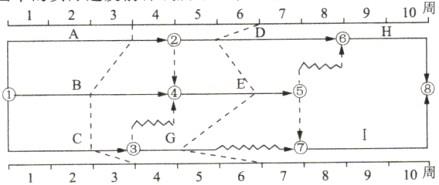 时标网络计划中以实箭线表示工作,以虚箭线表示虚工作,以波形线表示工作的自由时差。从图可知:关键线路为:①→②→⑥→⑧,第3周末,关键工作A不延迟,所以预计工期不拖后;第6周末,关键工作D延迟一周,预计工期拖后1周;在第4周至第6周内只有工作A和E进度正常,B和D工作各延迟1周。