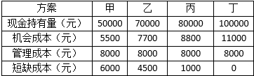 某企业现金管理由四个方案供选择,其最佳现金持有量方案为( )方案。 (2015)A.甲 B.乙 C.丙 D.丁