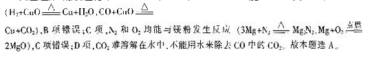 下列除杂操作可行的是( )。A.通过浓硫酸除去HCl中的H2O B.通过灼热的CuO除去H2中的CO C.通过灼热的镁粉除去N2中的O2 D.通过水除去CO中