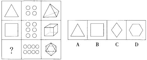 从每行来看,第三个图形为正多面体,第一个图形是正多面体每一面的形状,第二个图形中小圆形的个数是正多面体面的个数。