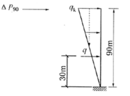 已知作用于90m高度屋面处的风荷载标准值wk=1.50kN/m2,作用于90m高度屋面处的突出屋面小塔楼风荷载标准值△P90=600kN。假定风荷载沿高度呈倒三角形分布,地面处为0,如图所示。则在高度z=30m处风荷载产生的倾覆力矩设计值最接近于( )kN·m。