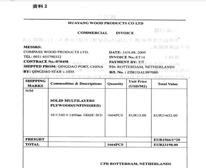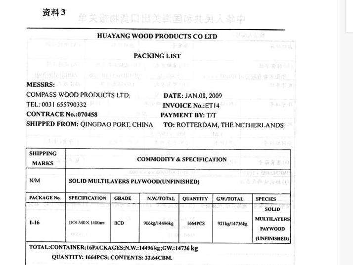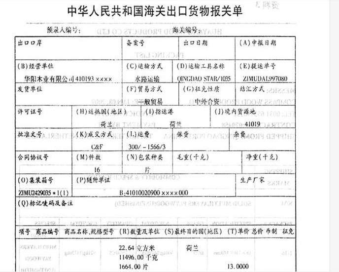 河南华阳木业有限公司(410193XXXX)于2009年1月18日将计划出口的多