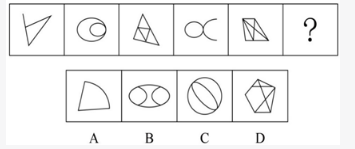 第一步,观察特征。组成元素不同,优先考虑数量类或属性类。第2个图形是○的相切,为常考的一笔画图形,考虑一笔画。第二步,一条式,从左到右找规律。观察题干,图形奇点依次为:2、0、0、2、2,均能一笔画成,排除B、D项。继续观察,直线图形和曲线图形交替出现,呈周期规律,问号处应选择曲线图形,只有C项符合。因此,选择C选项。