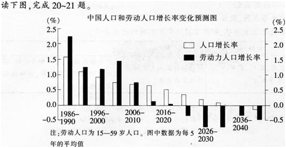 人口增长率为正值时,其人口总量将不断增加,当人口增长率为零时,则该国人口总量将不再增加,其人口总量达到最大值。从图中信息可知,在2036--2040年期间,我国人口增长率为零,则我国人口总量达到最大值。在2035年以前,我国人口增长率大于零,人口总量不断增加。