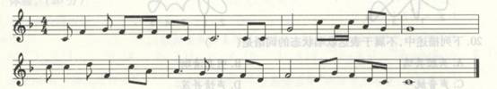 调号为一个降号,旋律共有五个音,F—A为音阶里唯一一个大三度,符合五声音阶里“宫一角”唯一一个大三度的音程关系,且主音落在C上,推出F为富、C为徵,故答案为C五声微调式。