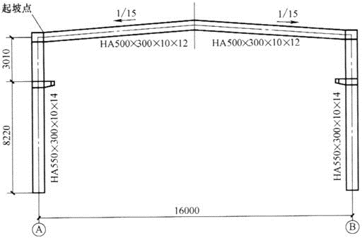 某车间为单跨厂房,跨度16m,柱距7m,总长63m,厂房两侧设有通长的屋盖纵向水平支撑。柱下端刚性固定。其结构体系及剖面如题图(Z)所示,屋面及墙面采用彩板,刚架、檩条采用Q235B钢,手工焊接使用E43型焊条。刚架的斜梁及柱均采用双轴对称焊接工字形钢(翼缘为轧制),斜梁截面为HA500×300×10×12,其截面特性为:A=119.6×10`2mm2,Ix=51862×10`4mm`4,Wx=2074.5×10`3mm3,Wy=360.3×103mm3;刚架柱截面为HA550×300×10×14,其截面特性为:A=136.2×10`2mm2,Ix=72199×10`4mm4,Wx=2625.4×10`3mm3,Wy=420.3×10`3mm3,ix=230.2mm,iy=68.0mm。