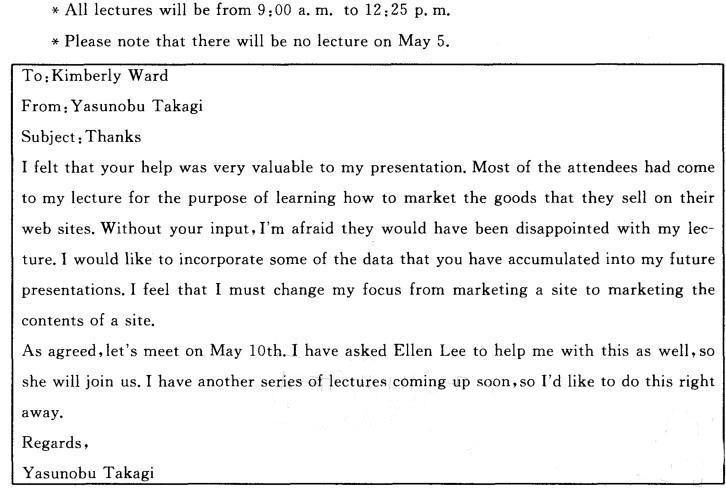 Takagi给Ward写的邮件中的下半部分中提到5月10号见面,并说届时,Lee也会参加这次会面。因此可以推知TakagKWard.Lee会在5月10号这一天会面。正确答案是D。