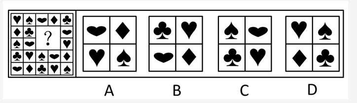 此题需要一列一列的看,观察到每一列中各种花色排列顺序一定,? ?? ? 交替出现。故正确答案为D。