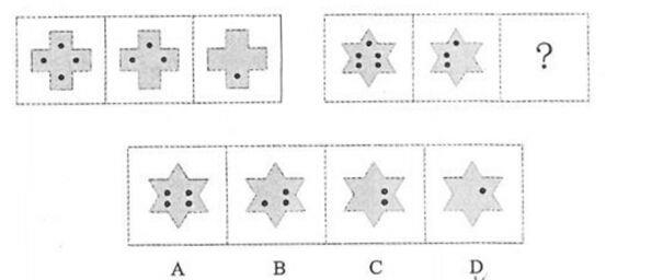 本题考查样式类。两段式的第一段中,第一个图形与第二个图形外部轮廓求同,内部的黑点相减得到第三个图形。因此,第二段中,第一个图形与第二个图形外部轮廓求同,内部黑点相减,得到C选项。