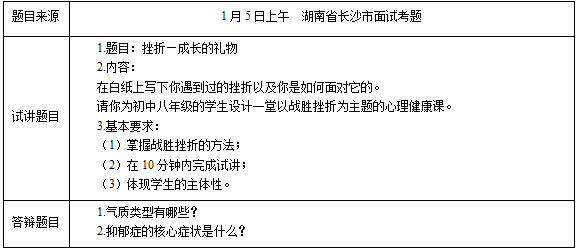 二、考题解析【教学过程】(一)热身活动:成长三部曲1.讲述规则(1)这个游戏分3个等级(鸡蛋、大鸡、凤凰),同学们围着场地站好。(2)开始大家都是鸡蛋,然后各自寻找周围的同学两两猜拳,赢的同学升级为大鸡,输的同学继续当鸡蛋,然后同等级的同学再相互寻找继续猜拳,鸡蛋长成大鸡,大鸡长成凤凰,凤凰就是最后的赢家,这过程中输的同学必须降级,大鸡变鸡蛋,如此循环直到只剩下最后一个鸡蛋。2.完成活动3.交流讨论师:在游戏中你有从大鸡变成鸡蛋的过程吗?你的感受是什么?生:有,觉得好倒霉啊,马上就成凤凰了,结果又变成了鸡蛋,还得重头再来。4.提出主题成长过程中也不是一帆风顺的,都会遇到一些挫折。(二)主题活动一:大家来说一说1.讲述规则(1)在白纸上写下你遇到过的挫折以及你是如何面对它的。2.完成活动3.交流讨论师:你遇到的挫折是什么?你是如何面对的?生1:小时候学自行车时一直学不会,看到别的小朋友都学会了,我心里很难受。后来我就放弃了。生2:进入初中以后,我的成绩不像小学时那么优秀了,后来我更比以前更加努力的学习了。师:面对挫折,我们究竟该逃避还是迎难而上呢?为什么?生:应该迎难而上,人生不是一帆风顺的,如果遇到挫折就选择逃避,那我们就很难取得成功。4.教师小结我们应该学会如何克服挫折。(三)主题活动二:我的良方送给你1.讲述规则伴随着音乐写下好的克服挫折的方法送给你的同桌。2.完成活动3.交流讨论师:你收到的克服挫折的方法是什么?生1:学会寻求他人的鼓励和帮助,提高自己的自信心,不轻言放弃。生2:确定切实可行的目标,对自身有一个合理的认识。中公讲师解析4.教师小结在面对挫折的时候,我们要学会克服挫折。(四)总结升华一起聆听《阳光总在风雨后》,希望同学们都可以学会面对挫折。【板书设计】挫折—成长的礼物寻求帮助提高自信不言弃调整目标1.气质类型有哪些?2.抑郁症的核心症状是什么?
