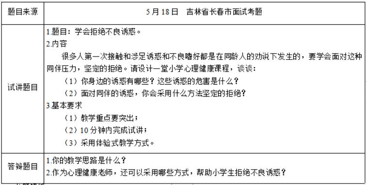 二、考题解析【教学过程】(一)热身活动:“火眼金睛”1.活动内容图片展示。2.完成活动3.讨论交流师:根据图片内容区分出哪些是正常生活场景,哪些是不良诱惑?生1:邀请同学一起写作业、一起看电视等都是正常的,我们生活中经常这样做。生2:让别人一起去网吧打游戏、一起吸烟、一起赌博等都是不良诱惑。4.提出主题会有各种诱惑充斥在我们生活中,对我们的身心健康、学习和生活产生很多危害,所以我们要能够在日常生活中快速识别出哪些是不良诱惑。让我们一起走进今天的心理课堂,学习如何拒绝不良诱惑。(二)主题活动一:案例分析1.活动内容小华是一名小学五年级的男生,表现和成绩都很优秀,非常受老师和其他同学的喜欢,还一度被评为“三好学生”。但是,在一年暑假,因为邻居小伙伴的引诱开始迷上网络暴力游戏。然后他整个人都变了,上课走神,作业也不能按时完成,老师的管教他也不听。甚至为了有钱打游戏,还找低年级学生要钱,不给就欺负他们。2.讨论交流①师:经过一个暑假小华都有哪些变化?生:成绩下降,不服老师管教,还欺负别人。②师:什么原因导致小华的变化?生:因为他迷上了网络暴力游戏。③师:长此以往,会给小华带来什么危害?生:不仅让他成绩下降,还会变得暴力、疏远朋友,甚至会走上违法犯罪的道路。3.教师小结不良诱惑给我们带来的危害非常大,一旦我们妥协,就很容易遭到不良诱惑的侵袭,给我们的学习和生活带来沉重的打击。(三)主题活动二:献计献策1.活动内容给大家10分钟的时间思考一下你在生活中遇到过哪些不良诱惑,你当时是如何解决的。如果现在面对同样的问题你会怎么解决。2.讨论交流①师:你在生活中遇到过什么不良诱惑,你当时是如何面对?生1:有一次为了快点完成作业一起玩,朋友劝我抄答案。我拒绝了他的建议,并告诉他抄答案是不诚信的行为。生2:以前班级里有些男生偷偷吸烟,邀请我加入,我认为吸烟不利于身体健康,拒绝并且远离他们。生3:好朋友曾经邀请我一起去网吧玩游戏,我不知道如何拒绝只能跟他一起去,结果成绩下降非常严重。②师:当再次面对同伴的不良诱惑,你会采用什么方法坚定的拒绝?生1:我会直接拒绝他,并劝他也远离不良诱惑,如果他坚持不改,我就远离他。生2:我会向老师和家长寻求帮助。生3:我会坚定地拒绝他,并且告诉他不良诱惑的危害有哪些,让他也主动远离不良诱惑。3.教师小结在面对同伴的不良诱惑时我们要立场坚定,坚决拒绝并且引导同伴远离不良诱惑,实在无能为力时,及时求助于家长和老师,减少不良诱惑给我们带来的伤害。(四)总结升华让学生分享本节课的收获,进一步巩固学习的重难点内容。【板书设计】[img]/upload/tiku/397/10752780_1.png[/img]【答辩题目解析】1.你的教学思路是什么?【参考答案】我的整个教学思路分为三步,分别是热身活动,主题活动和总结升华。首先,在热身活动,我利用多媒体进行图片展示的方式引入今天的主题,帮助学生快速地识别出生活中的不良诱惑。其次,是我们主题活动。在主题活动一,通过让学生对案例进行分析,引导学生认识到不良诱惑带来的危害。然后在主题活动二,设计了抵制不良诱惑加油站的小游戏,让学生动脑筋思考在面对不良诱惑的时候应该怎么办。从学生的角度为其他学生提供的建议,更容易被同龄人接受。最后,我让学生分享本节课自己的收获,对于今天学习内容行巩固。2.作为心理健康老师,还可以采用哪些方式,帮助小学生拒绝不良诱惑?【参考答案】作为一名心理健康老师除了以实际的生活经历引导学生拒绝不良诱惑,还可以从以下几个方面帮助学生拒绝不良诱惑。(1)增强判断是非的能力和水平社会生活没有纯粹的净土,学校和家庭也不可能屏蔽所有的信息。在复杂的环境和事物面前,清楚什么该做什么不该做非常重要。(2)经常内省引导学生时刻对自己的行为进行自我检查、反省评价、及时纠正自我错误,防止自己对不良嗜好产生错误的认识和尝试的欲望。(3)加强意志锻炼只有意志坚强的人才能克服各种因素,抵制不良诱惑,而意志弱者一旦遇到困难就会自甘堕落,心灰意冷。(4)学会自我调节在遇到问题与困难的时候,避免产生消极情绪,学会对自己的思想和行为进行调节。尤其是当情绪不佳时,寻找合适的宣泄渠道,以正确的方式面对,防止不良诱惑侵袭。