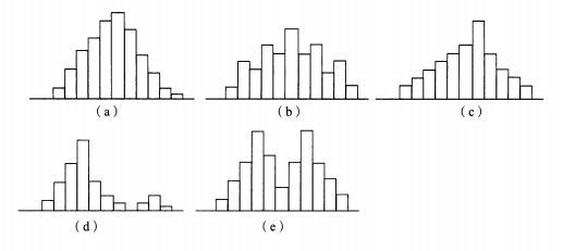 下列直方图中,属于异常直方图的有( )。 A.(a) B.(b) C.(c) D.(d) E.(e)