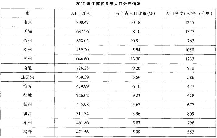 由表格第二、四列可知,宿迁市面积为471.56÷552720÷480=1.5万平方公里,徐州市面积为858.05÷762