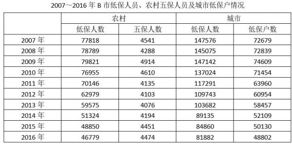 2016年B市有农村低保户数28925户,低保人数46779人;全年累计支出低保金38402万元。农村五保供养人数4474人,其中:集中五保供养人数1711人,分散供养人数2763人;全年累计支出农村五保金5668.7万元、比上年增加支出596.3万元。2016年B市有城市低保户数48802户,低保人数81882人;全年累计支出低保金80215.8万元。