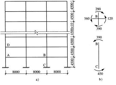 图所示的框架为某框架—剪力墙结构中的一榀边框架,其抗震等级为二级,底部一、二层顶梁截面高度为700mm,梁顶与板顶平,柱截面为700mm×700mm。已知在重力荷载和地震作用下,柱BC的轴压比为0.75,节点B和柱BC未按“强柱弱梁”调整的组合弯矩设计值(kN·m)如图所示。[2012年真题]提示:①对应于地震作用标准值,各层框架承担的剪力均不小于结构总剪力的20%;②按《高层建筑混凝土结构技术规程》(JGJ 3—2010)作答。
