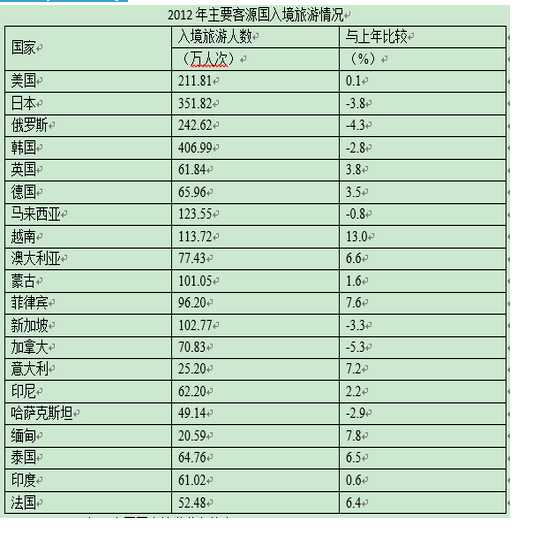 2012年,全国国内旅游人数29.57亿人次,比上年增长12.0%。其中,城镇居民19.33亿人次。2012年,全国国内旅游收入22706.22亿元人民币,比上年增长17.6%。2012年全年入境外国游客人数比上年增长0.3%,其中,亚洲市场入境人数1664.88万人次,与上年基本持平,占入境外国游客人数的61.2%;欧洲市场入境人数592.16万人次,增长0.2%;美洲市场入境人数317.95万人次,减少0.7%;大洋洲市场入境人数91.49万人次,增长6.5%;非洲市场入境人数52.49万人次,增长7.4%。