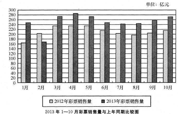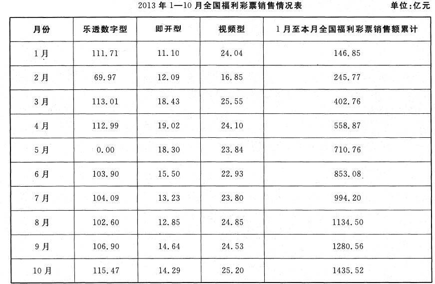 2013年2—10月中,乐透数字型福利彩票的销售额环比增加最多的月份是6月份(环比增量超过100亿元,远远高于其他月份)。6月份视频型福利彩票销售额为即开型福利彩票销售额的